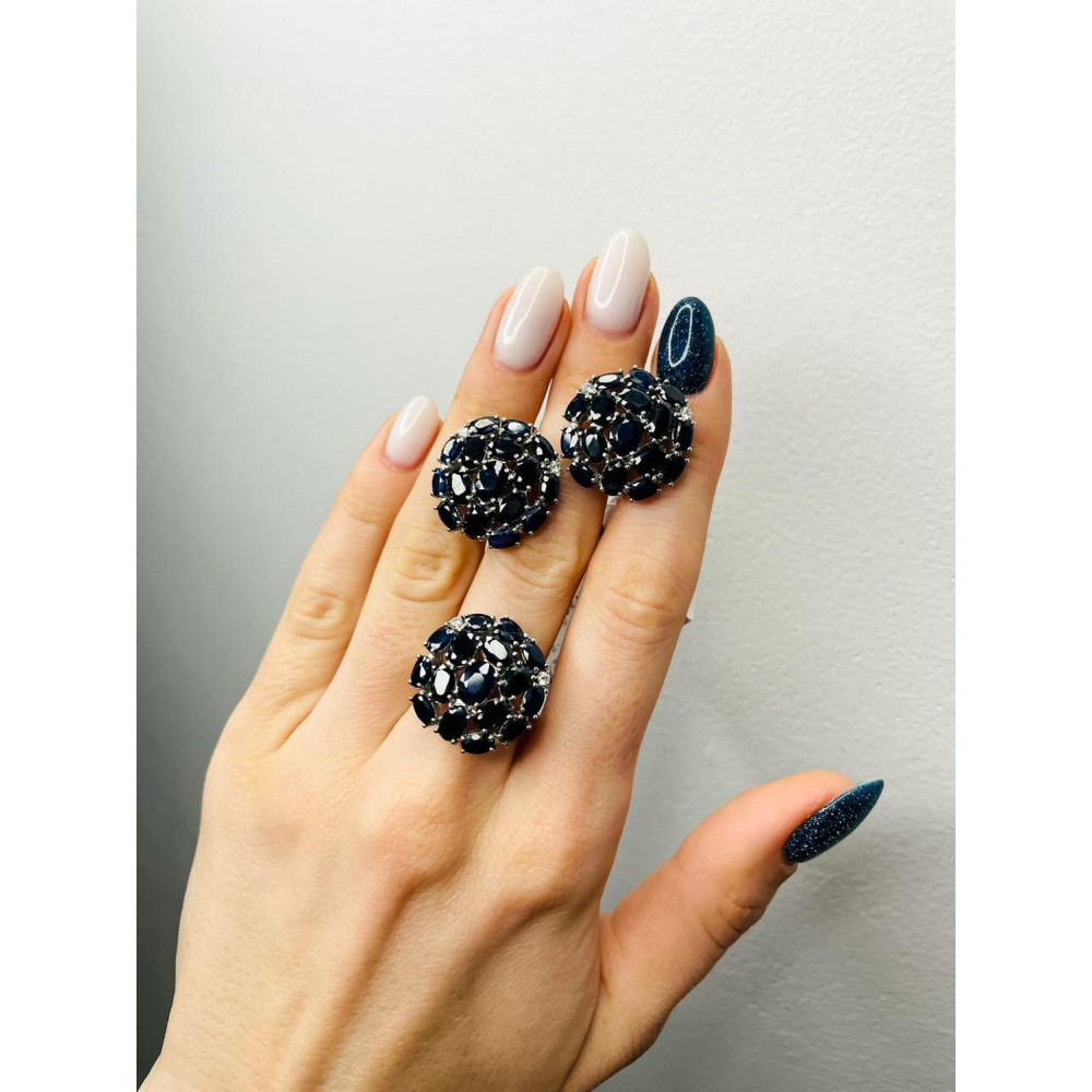 Женское серебряное кольцо с натуральным синий темным сапфиром, вес украшения: 5.92 грамм, размеры вставок в мм: сапфир 5х7 овал, сапфир 4х6 овал, сапфир 3х5 овал, фианит 2 круг