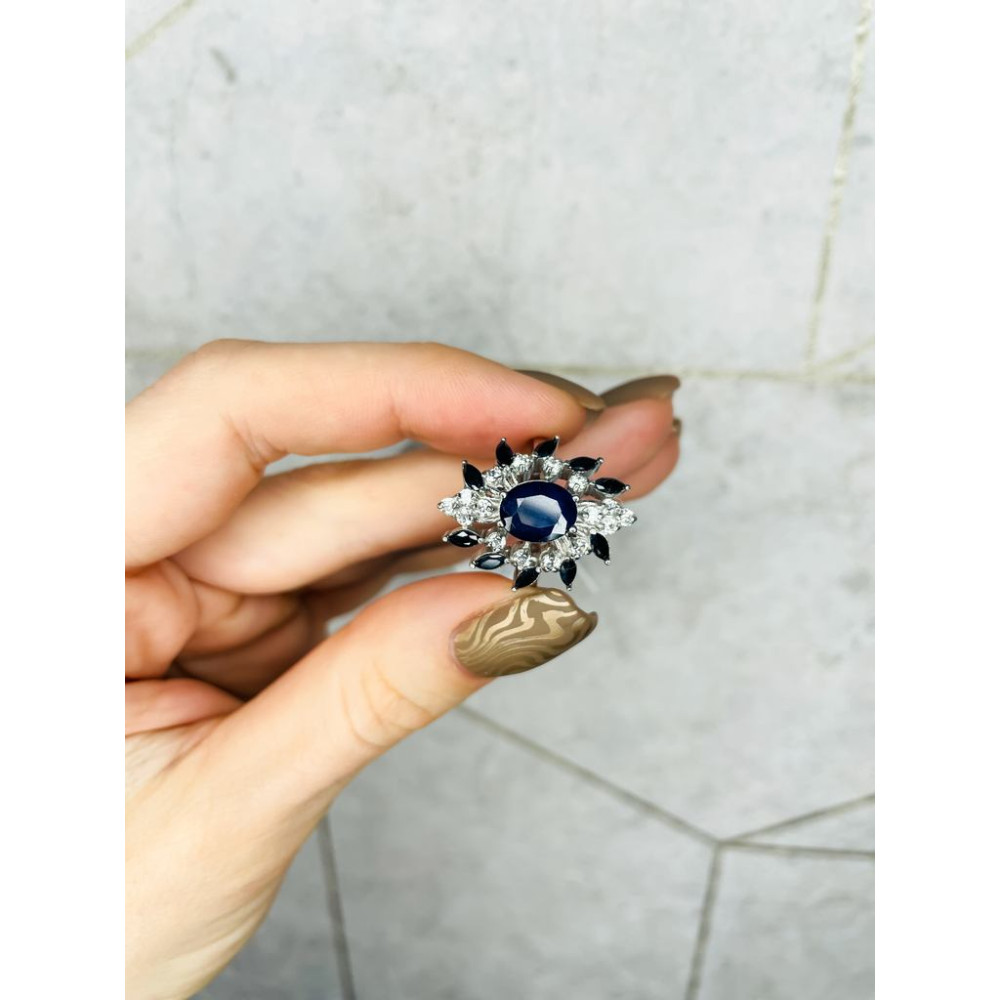 Женское серебряное кольцо с натуральным синий темным сапфиром, вес украшения: 6.19 грамм, размеры вставок в мм: сапфир 7х9 овал, сапфир 2х4 маркиз, фианит 2 круг