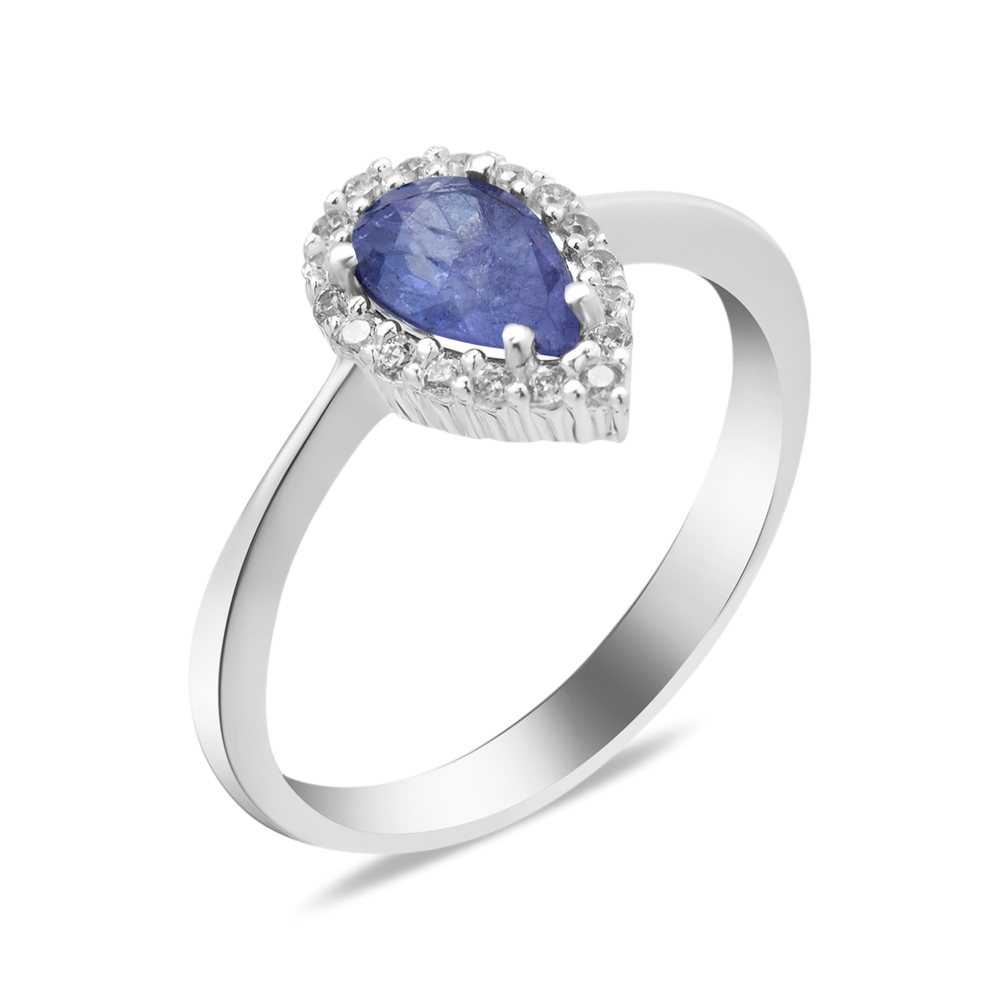 Женское серебряное кольцо с натуральным сине-фиолетовым танзанитом, вес украшения: 2.64 грамм, размеры вставок в мм: танзанит 5х8 груша, фианит 1,25 круг