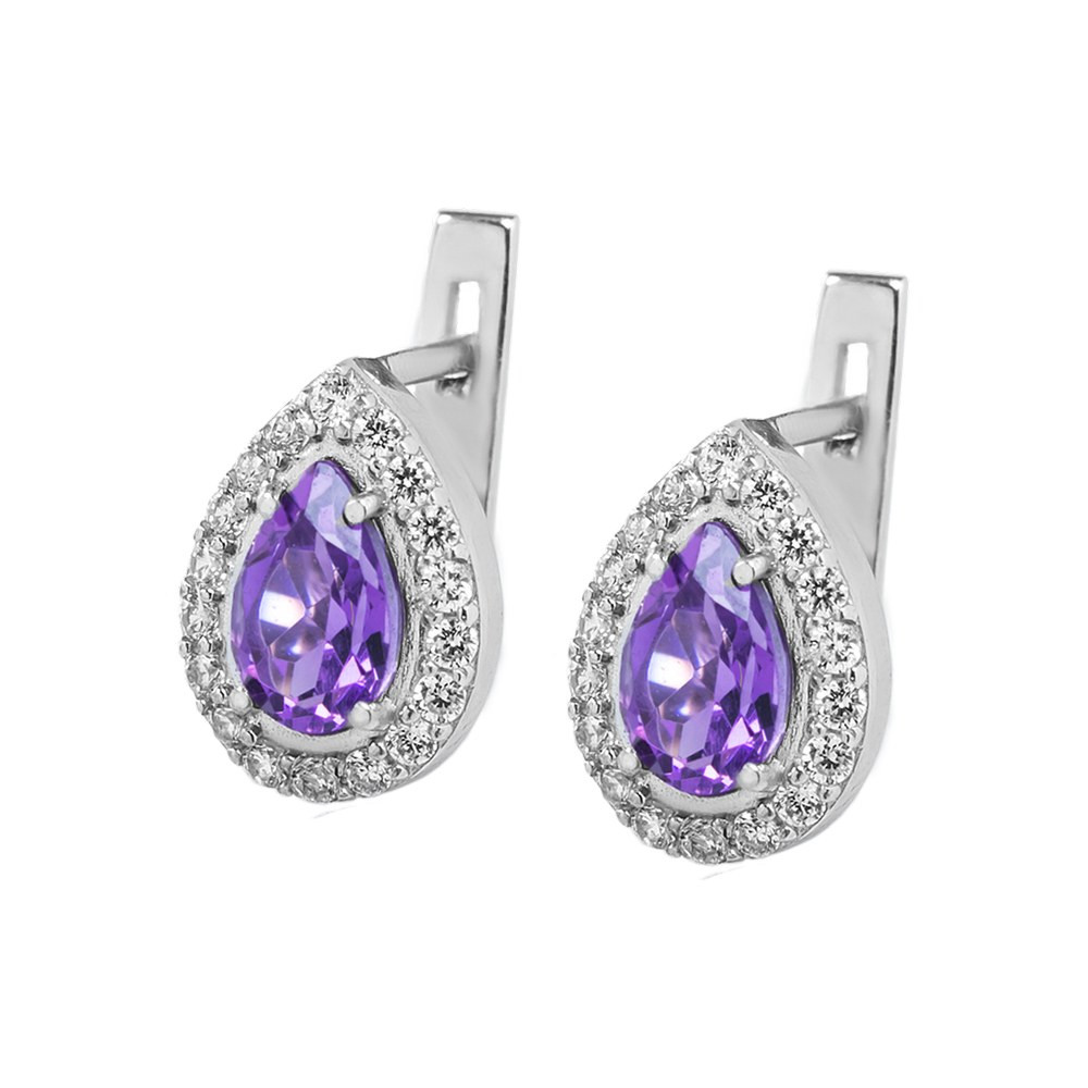 Women's silver earrings with inlays of amethyst and cubic zirconia