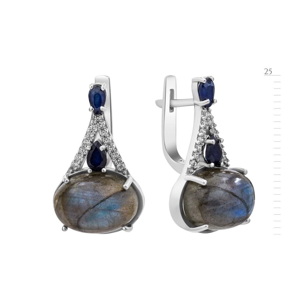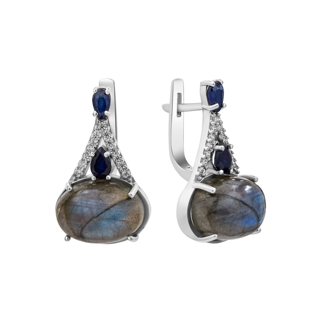 Женские серебряные сережки со вставками лабрадоритов, сапфиров и фианитов