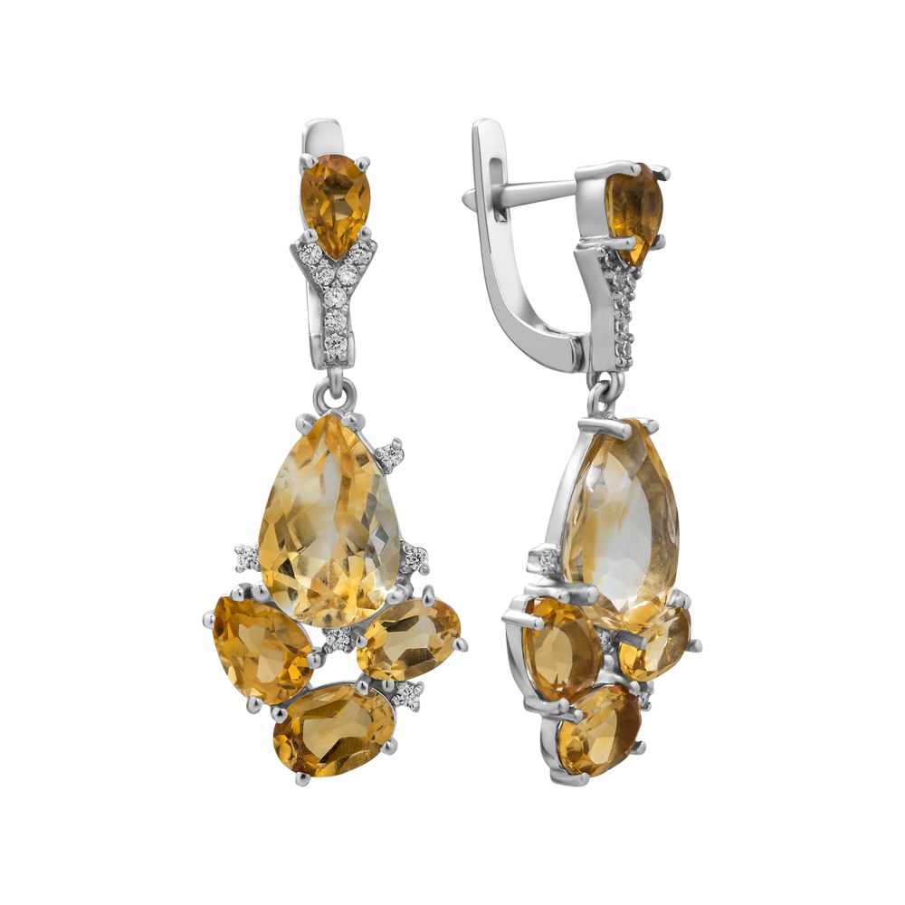 Women's silver earrings with citrine inserts and cubic zirconia