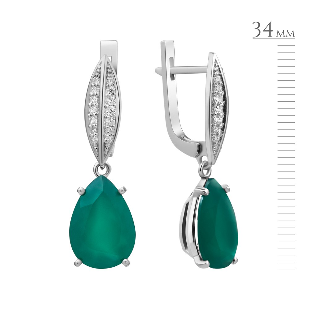 Женские серебряные серьги со вставками зеленого агата и фианитами