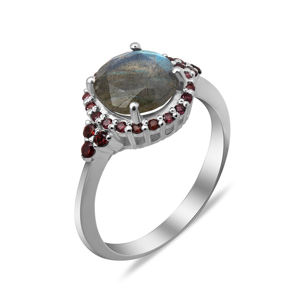 Жіноча срібна каблучка з вставками лабрадориту і гранатів