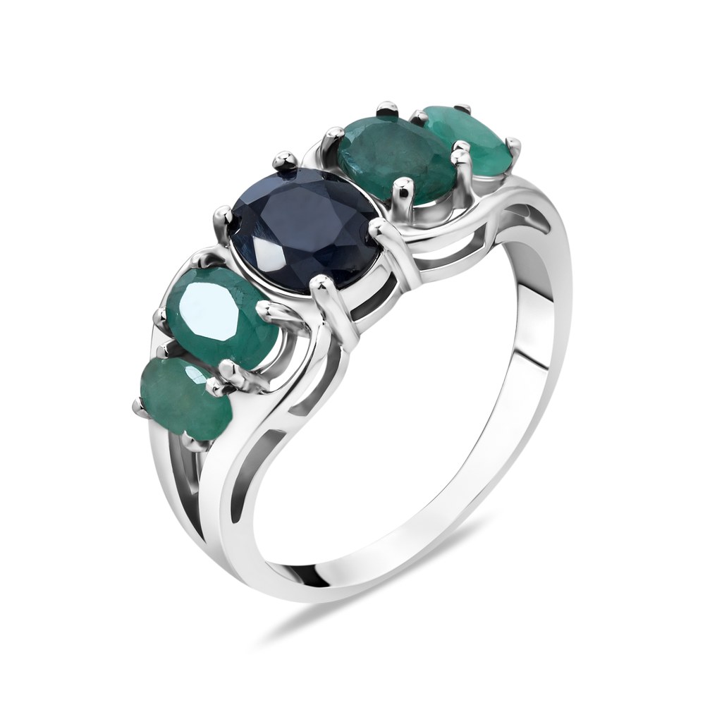 Жіноча срібна каблучка з вставками сапфірів і смарагдів