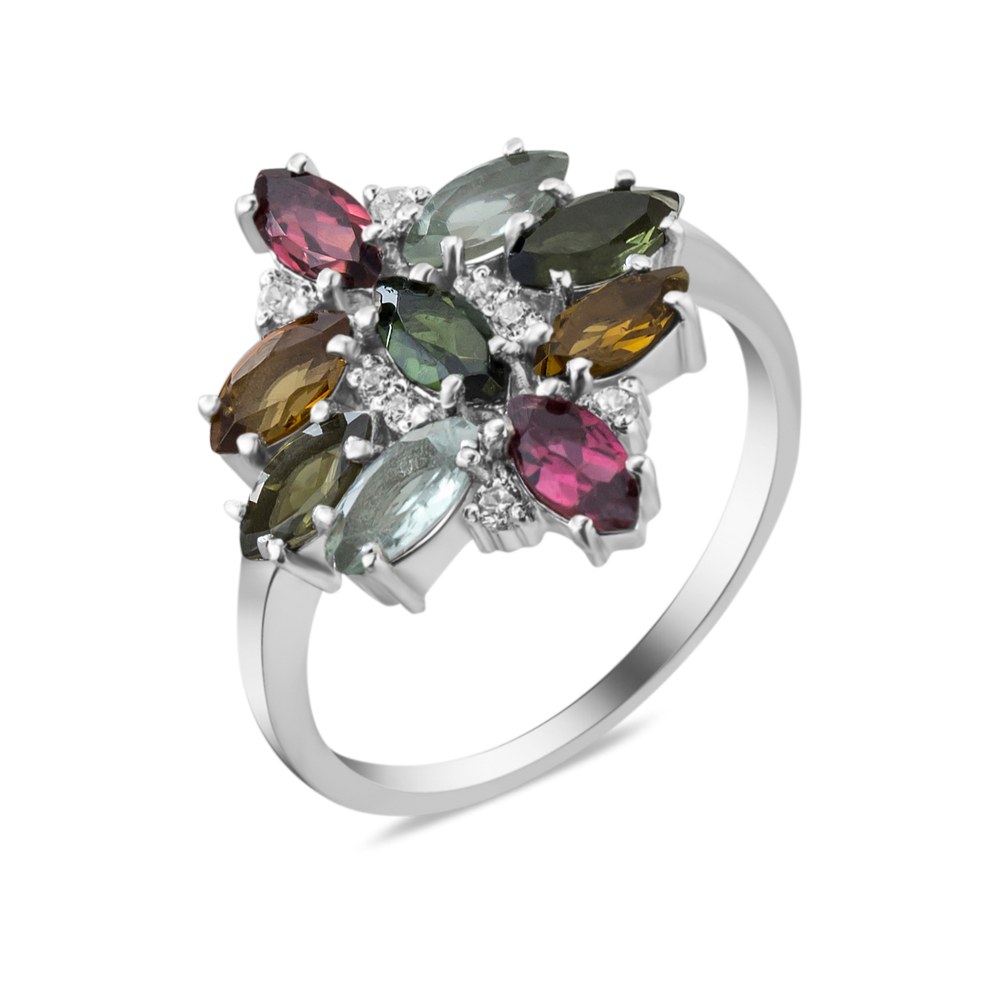 Женское серебряное кольцо со вставками турмалинов и фианитами