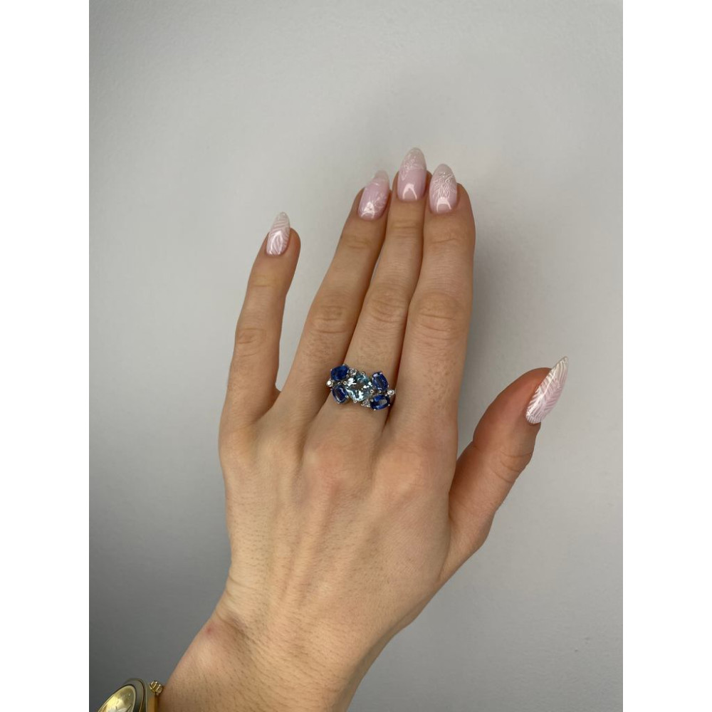 Жіноча срібна каблучка з вставками скай топазу, кіанітів і фіанітів