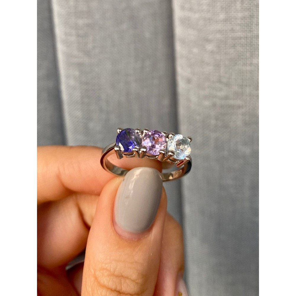 Жіноча срібна каблучка з вставками танзаніту, аметисту і блакитного топазу.
