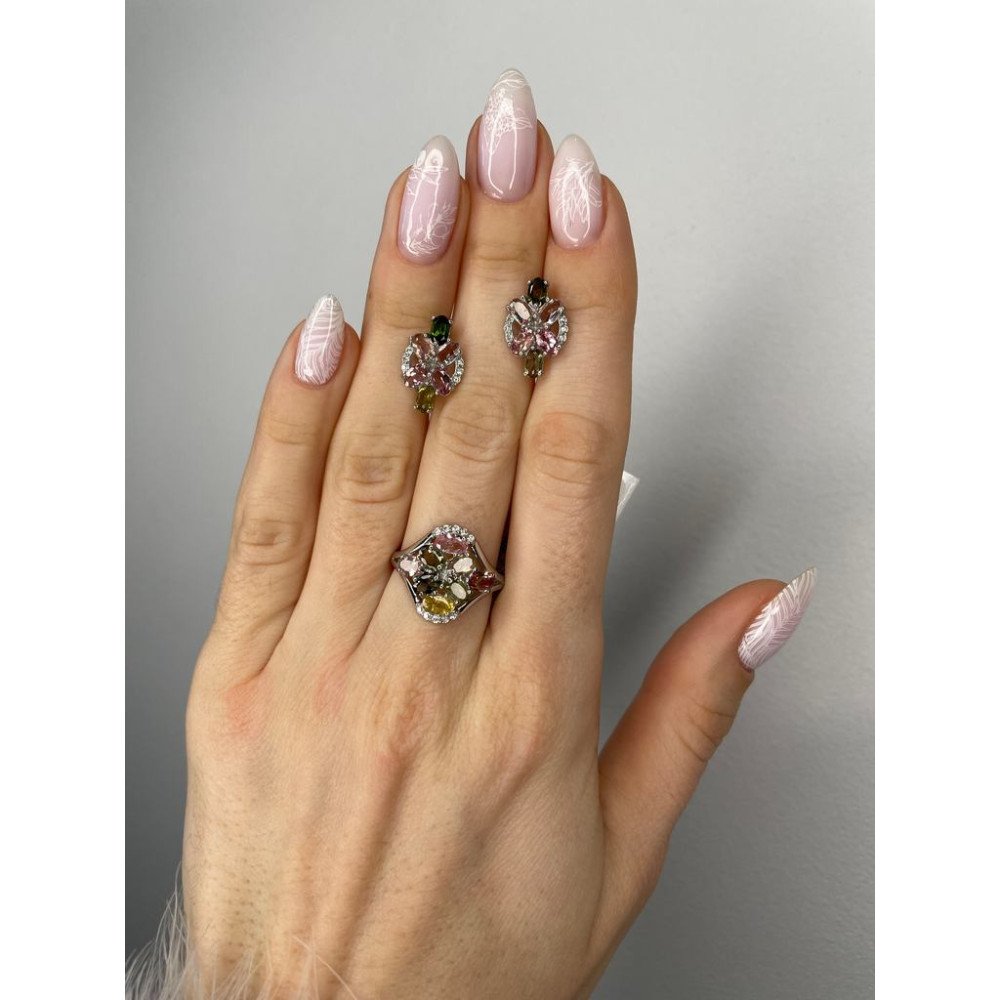 Жіноча срібна каблучка з вставками турмалінів і фіанітів