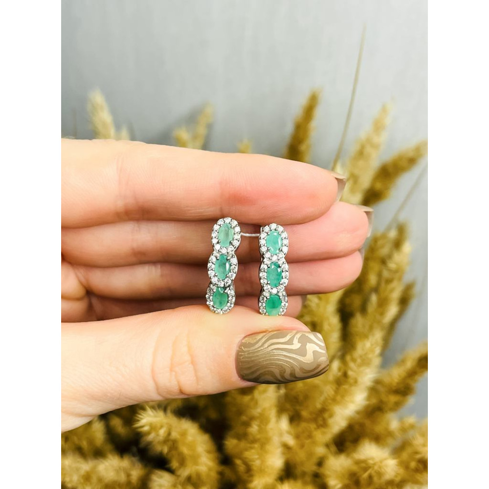 Женские серебряные серьги со вставками изумрудов и фианитами