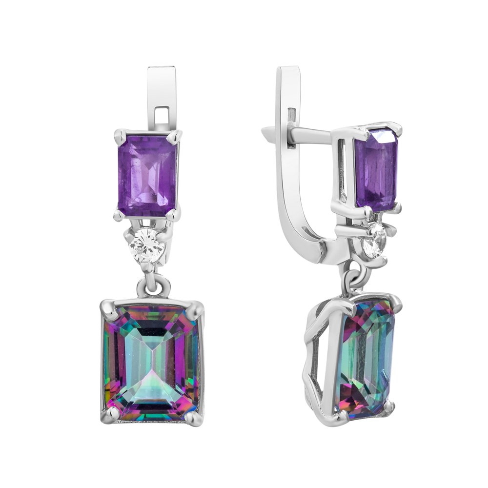 Женские серебряные сережки со вставками нано мистика, аметисту и фианитов