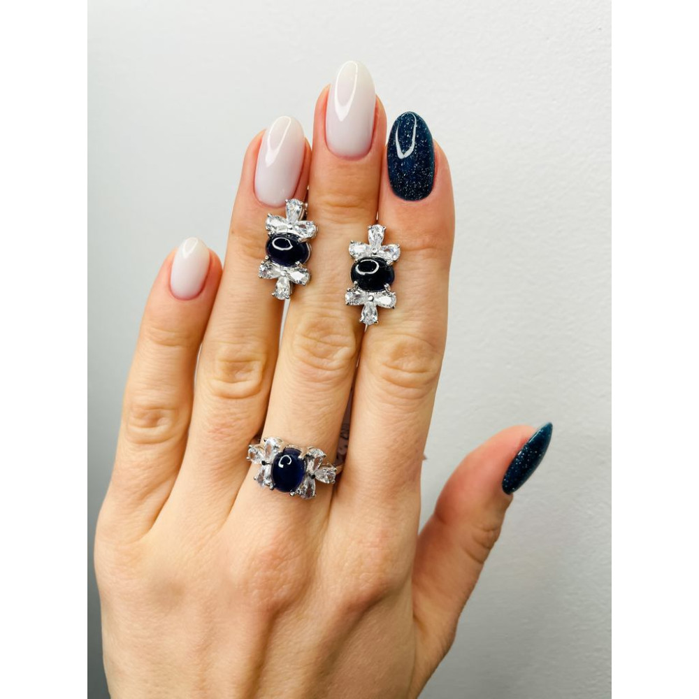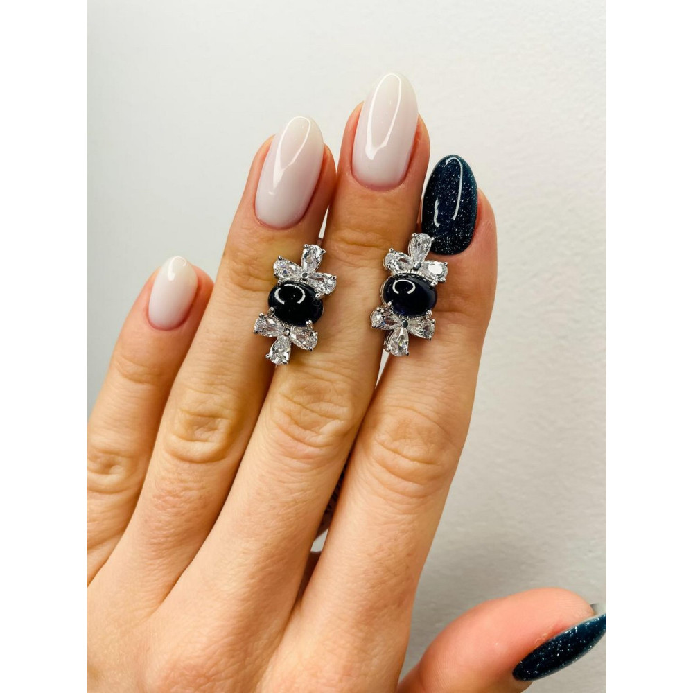 Женские серебряные серьги с натуральным синий темным сапфиром, вес украшения: 6.6 грамм, размеры вставок в мм: сапфир 7х9 к овал, фианит 3х5 груша