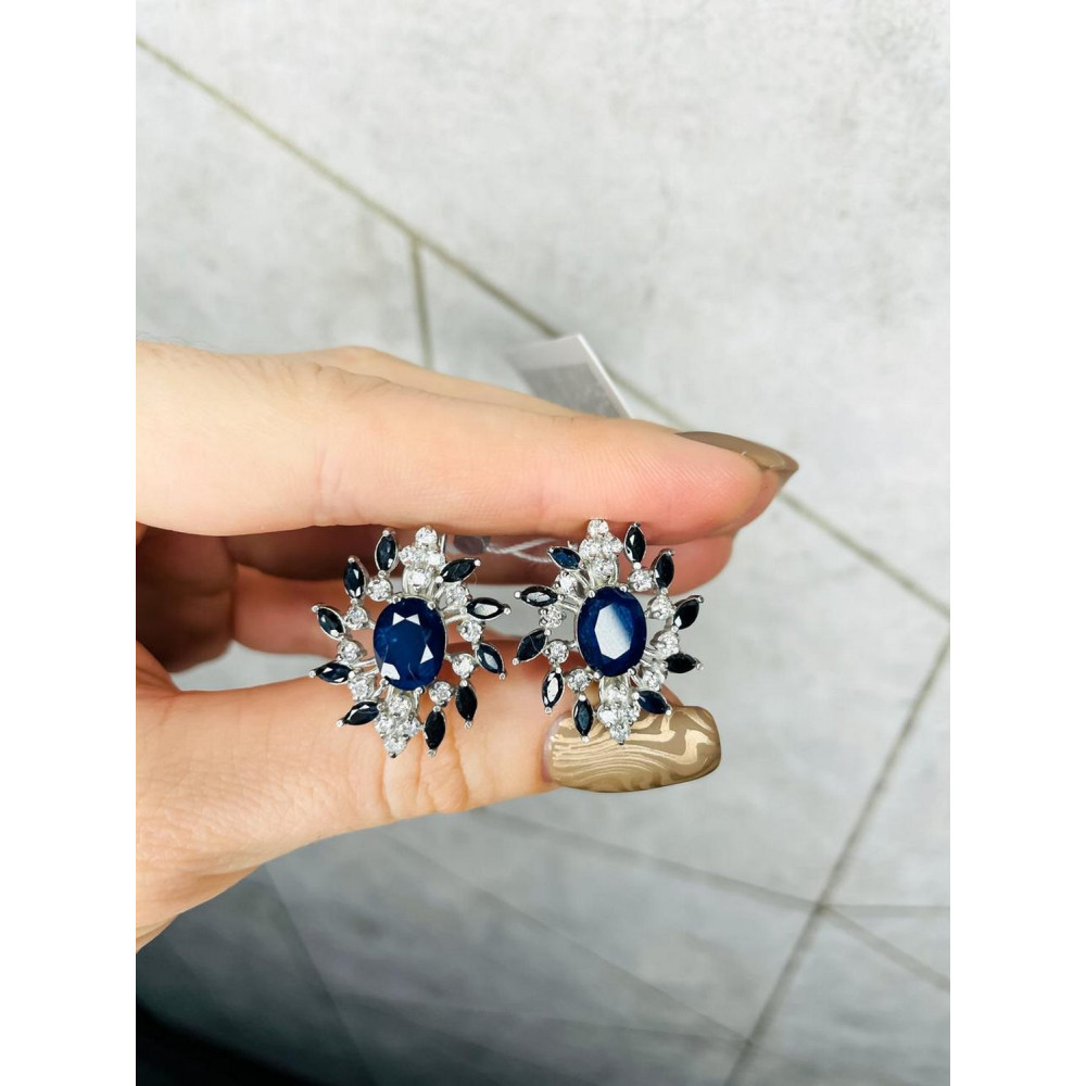 Женские серебряные серьги с натуральным синий темным сапфиром, вес украшения: 7.62 грамм, размеры вставок в мм: сапфир 7х9 овал, сапфир 2х4 маркиз, фианит 2 круг