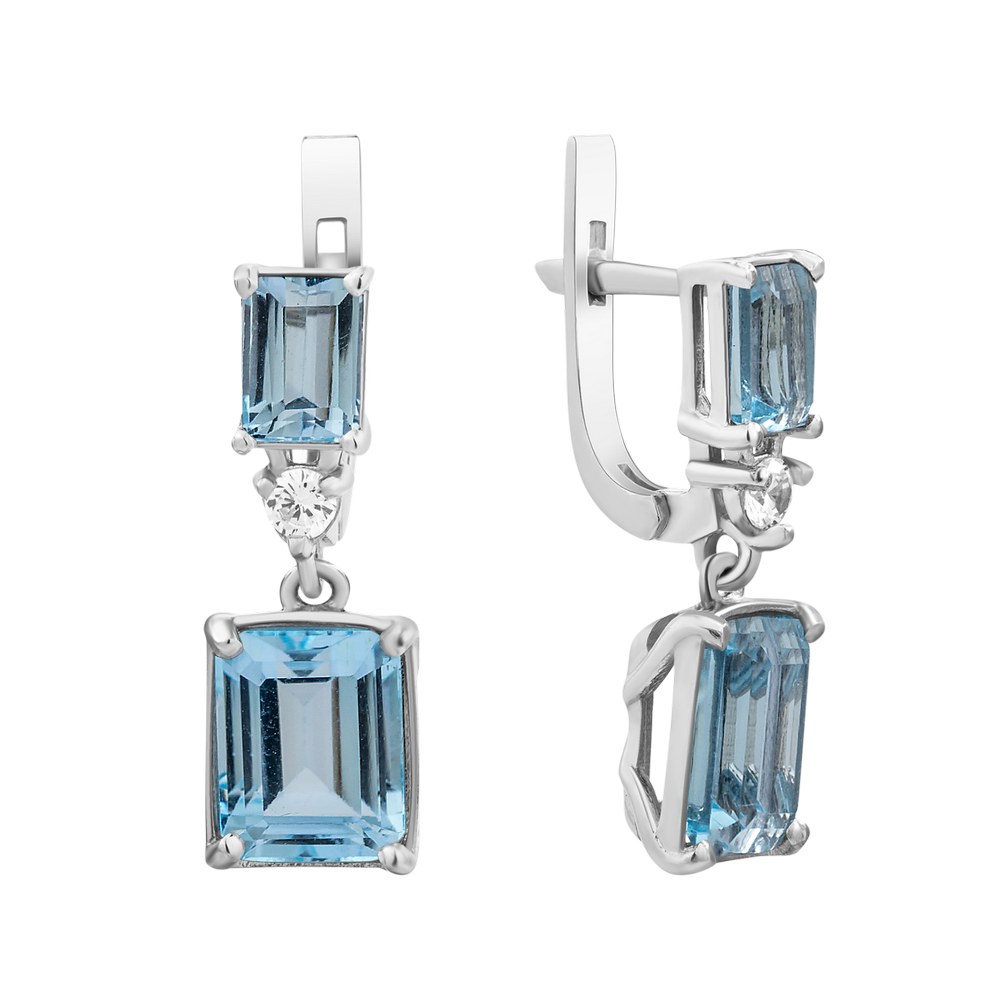 Женские серебряные серьги с натуральным голубой скай топазом, вес украшения: 6.13 грамм, размеры вставок в мм: скай топаз 8х10 октагон, скай топаз 5х7 октагон, фианит 3 круг
