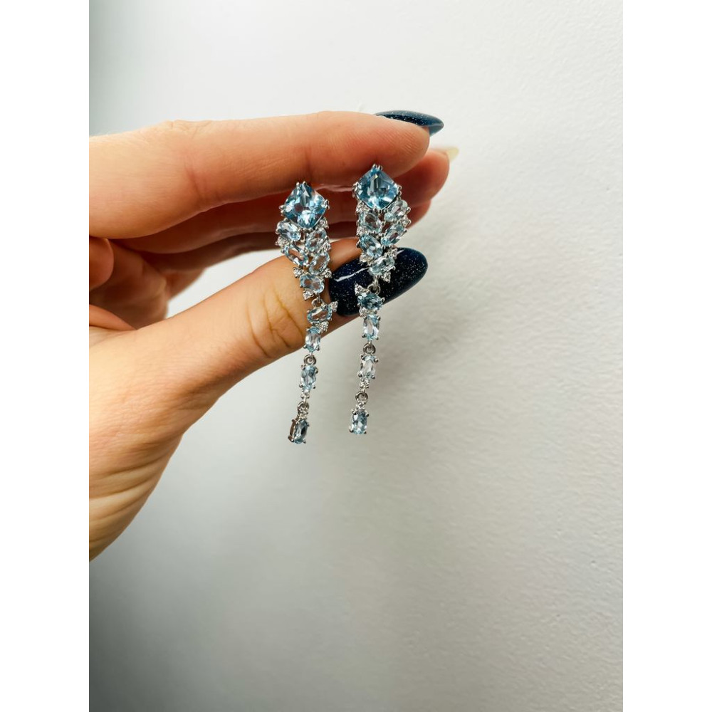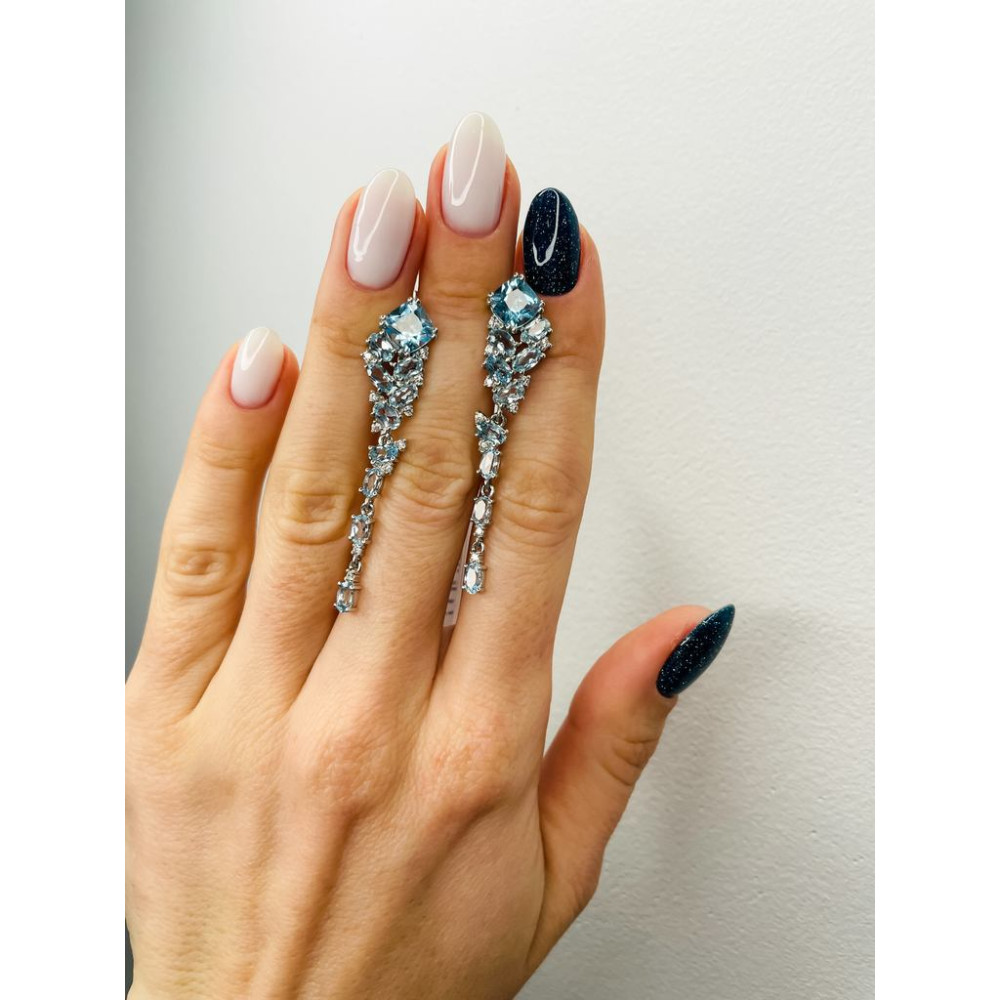 Женские серебряные серьги с натуральным голубой скай топазом, вес украшения: 7.68 грамм, размеры вставок в мм: скай топаз 7х7 кушон, скай топаз 3х5 овал, фианит 1,5 круг