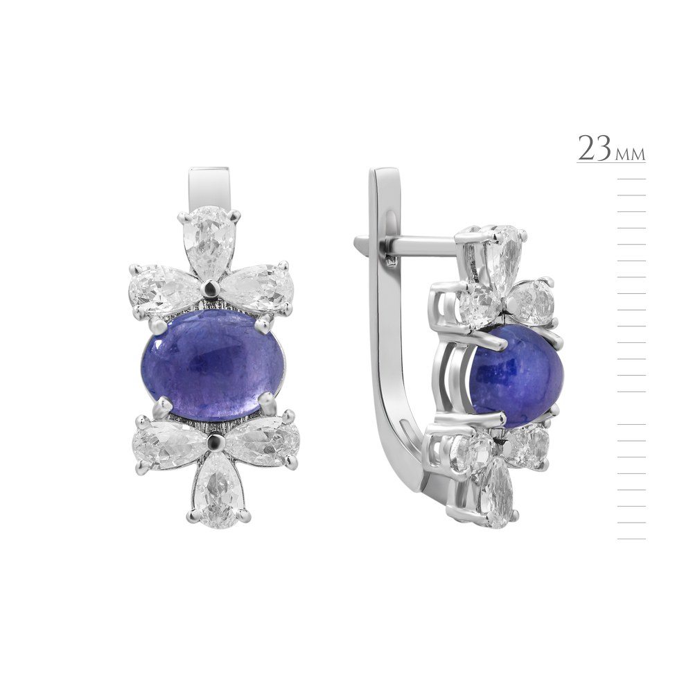 Женские серебряные серьги с натуральным сине-фиолетовым танзанитом, вес украшения: 6.66 грамм, размеры вставок в мм: танзанит 7х9 к овал, фианит 3х5 груша