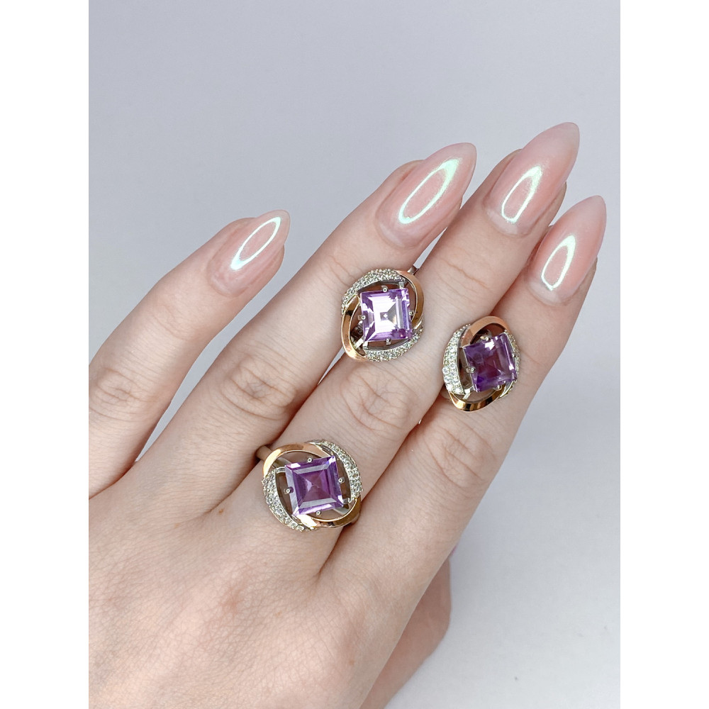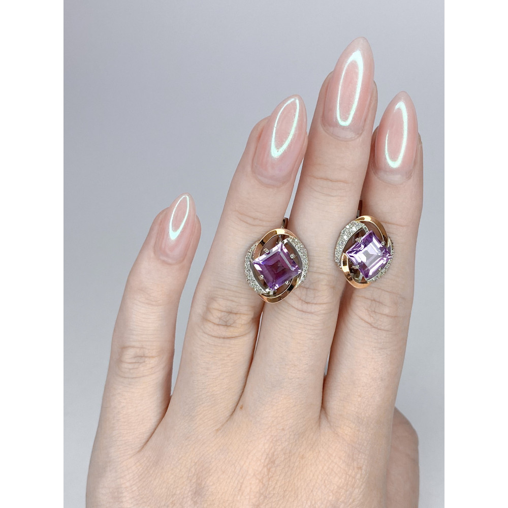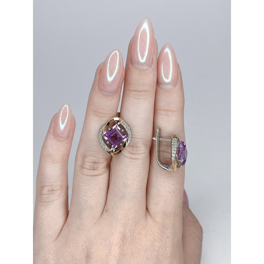 Жіночі срібніі сережки зі вставками золота, аметисту і фіанітів