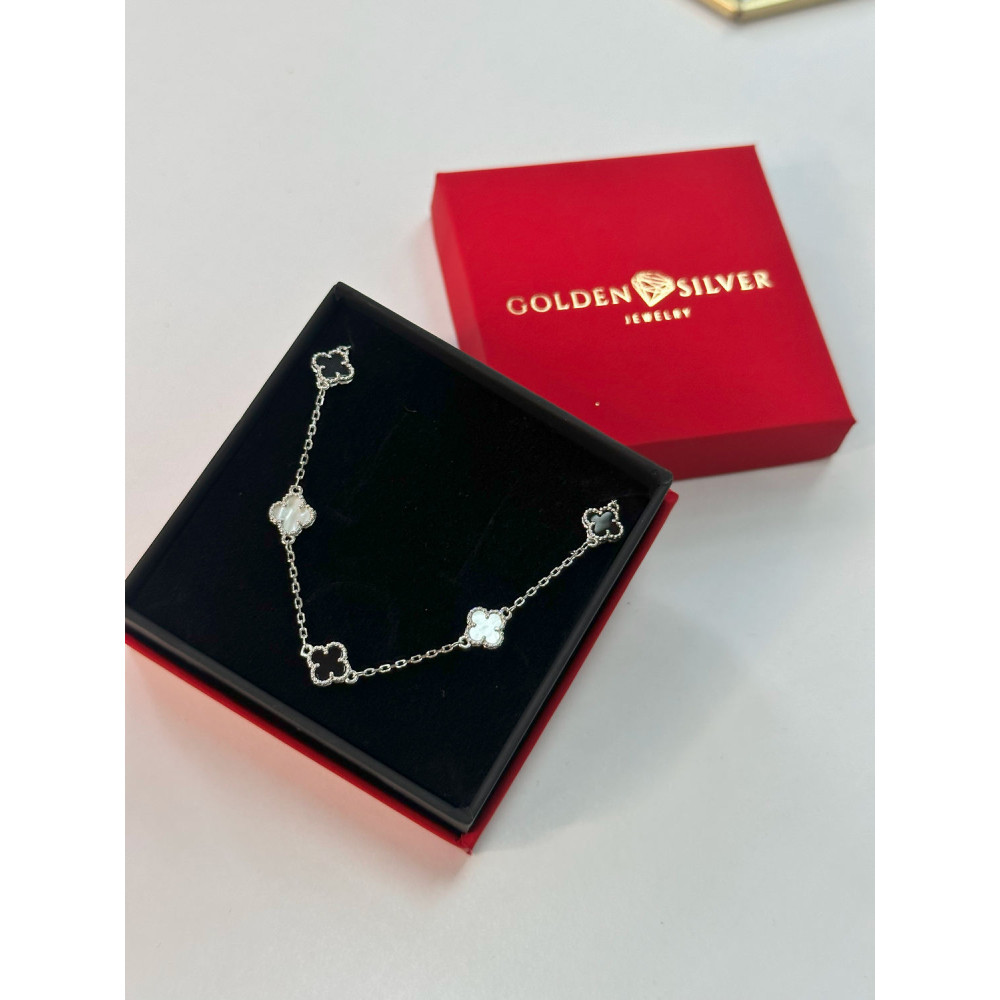 Жіночий срібний браслет зі вставками чорного оніксу та білого перламутру.