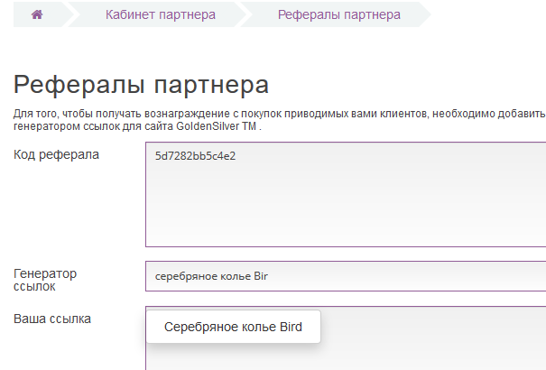 Після активації облікового запису ви відразу можете відправляти посилання як на головну сторінку, так і на будь-який обраний товар - скориставшись генератором посилань в кабінеті партнера