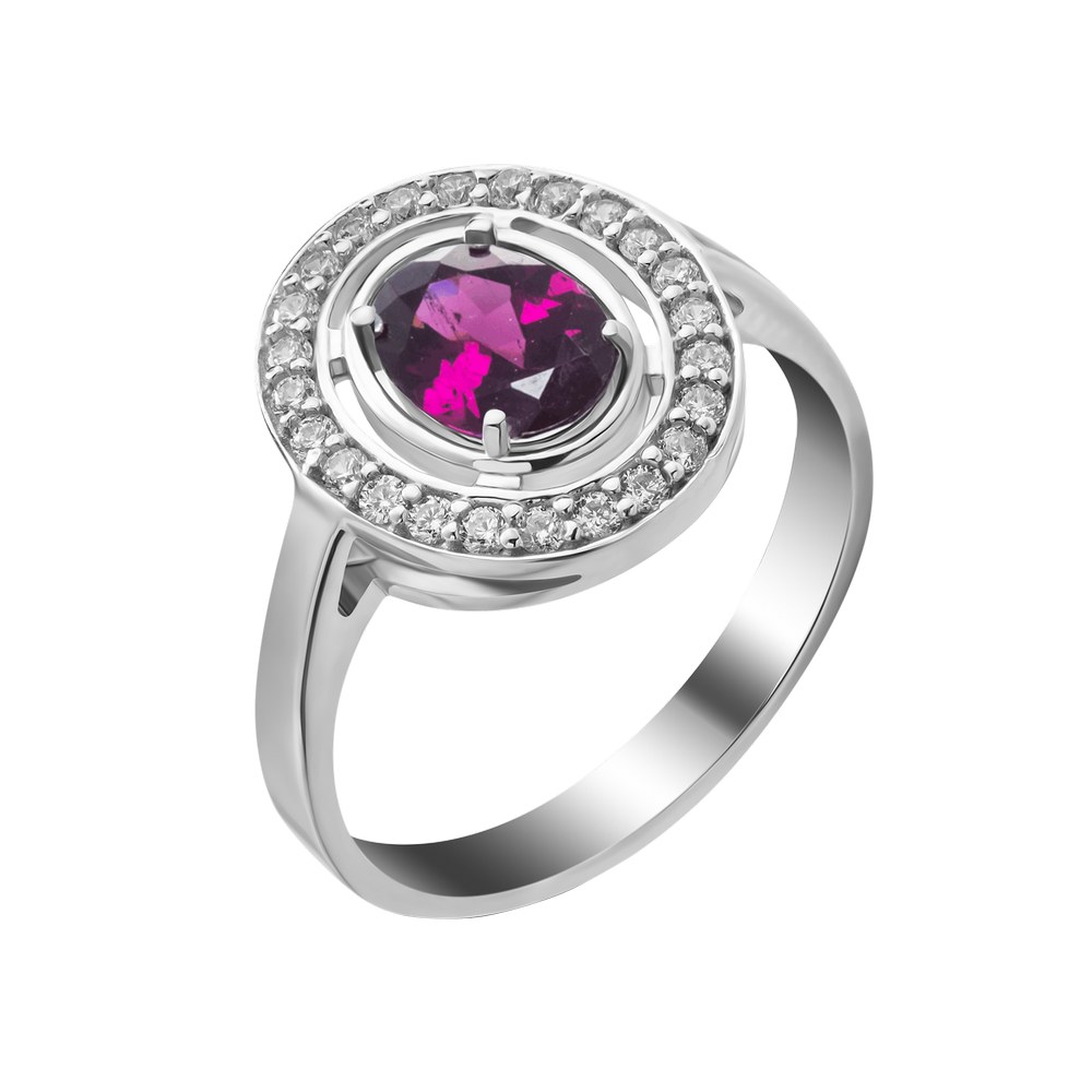 Жіноча срібна каблучка зі вставками родоліту і куб. цирконію
