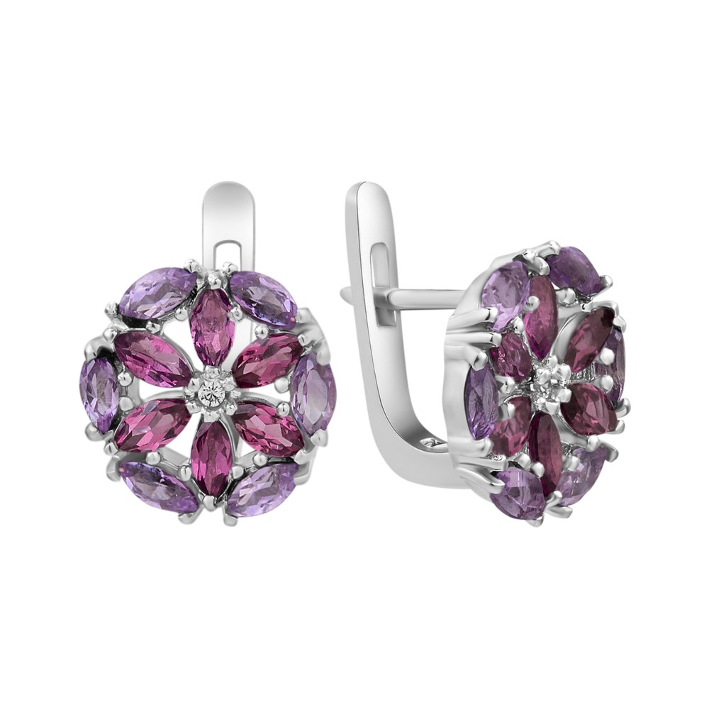 Жіночі срібні сережки зі вставками родоліту, аметисту і фіанітів