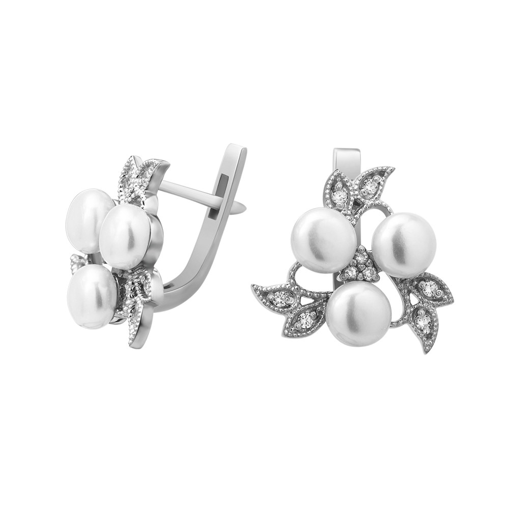 Жіночі срібні сережки зі вставками білої перлини культивованої і фіанітів